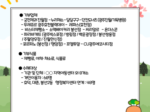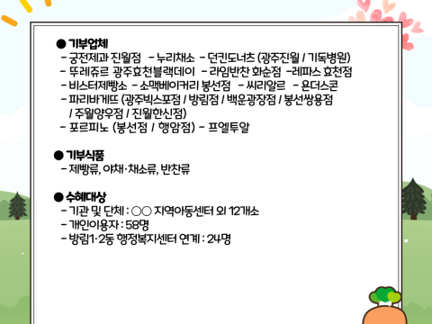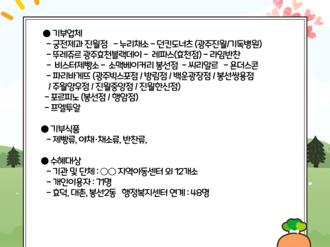 ■ 기부업체 : 궁전제과 진월점 외 18개소■ 기부식품 : 제빵류, 잔기지떡■ 수혜대상- 기관 및 단체 : 11개소- 개인..