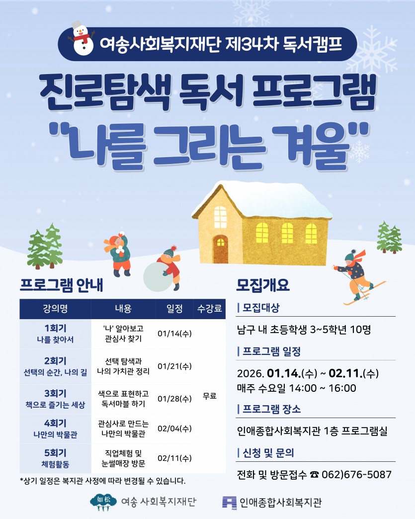 모집 2025년 여송사회복지재단 남구 초등학생을 위한 진로탐색 독서 프로그램 "나를 그리는 겨울" 참여자 모집
