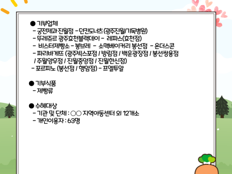 구기초푸드뱅크12월 3주차 기부식품 현황 안내■ 기부업체 : 궁전제과 진월점 외 19개소■ 기부식품 : 제빵류, 반찬류■ ..