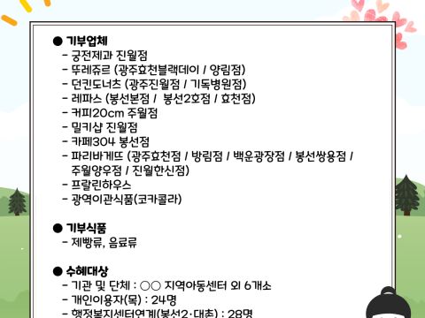 남구기초푸드뱅크1월 5주차 기부식품 현황 안내■ 기부업체 : 궁전제과 진월점 외 22개소■ 기부식품 : 제빵류, 우유, 과..