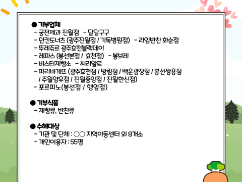 남구기초푸드뱅크10월 2주차 기부식품 현황 안내■ 기부업체 : 궁전제과 진월점 외 10개소■ 기부식품 : 제빵류, 야채ㆍ채..