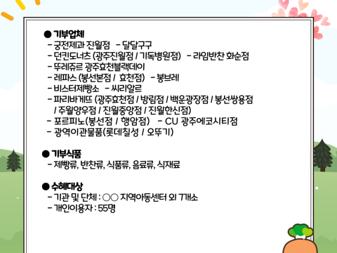 ■ 기부업체 : 궁전제과 진월점 외 18개소■ 기부식품 : 제빵류, 잔기지떡■ 수혜대상- 기관 및 단체 : 11개소- 개인..