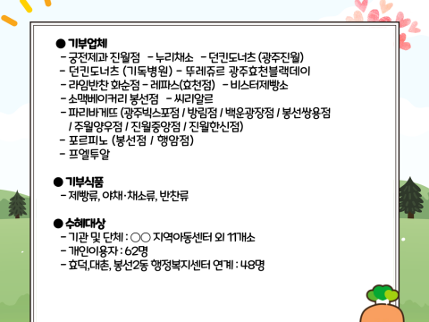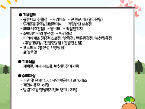 남구기초푸드뱅크8월 5주차 기부식품 현황 안내■ 기부업체 : 궁전제과 진월점 외 19개소■ 기부식품 : 제빵류, 야채, 채..